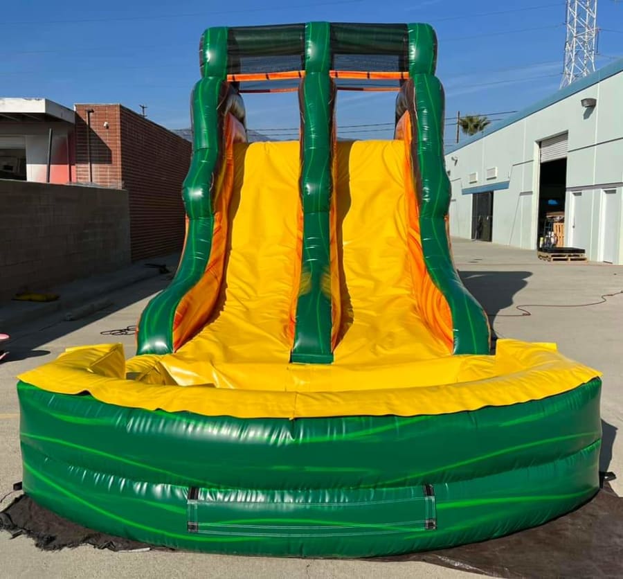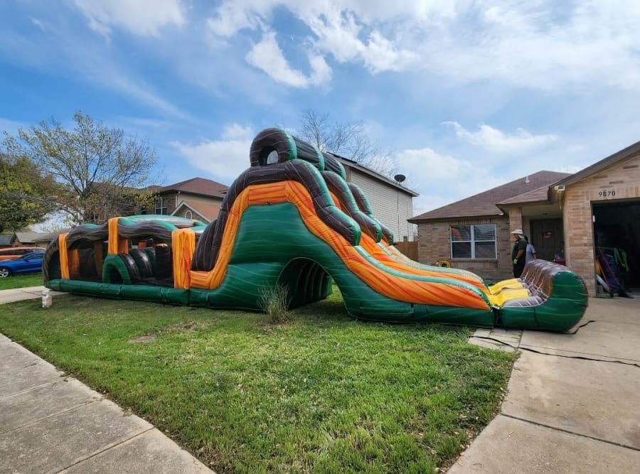 Our Jungle Obstacle Course is 52 feet long while it's 14 feet wide and 16 ft tall where the water slide part is. This Obstacle course is 2 parts at 26 feet each. If interested in just renting one piece of this obstacle course let us know.